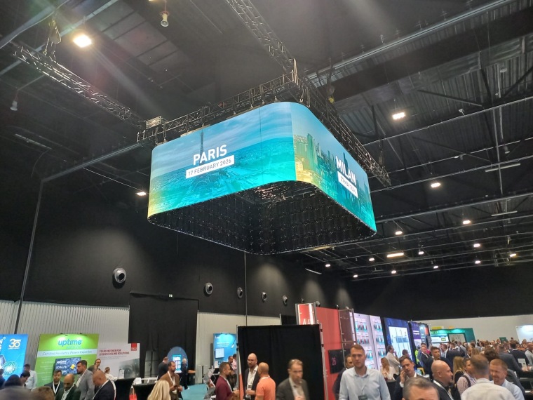 Przkład: wynajem ekranu diodowego HD2 na stoisko targowe, podwieszanie ekranów diodowych na targach, Dusseldorf, 2016